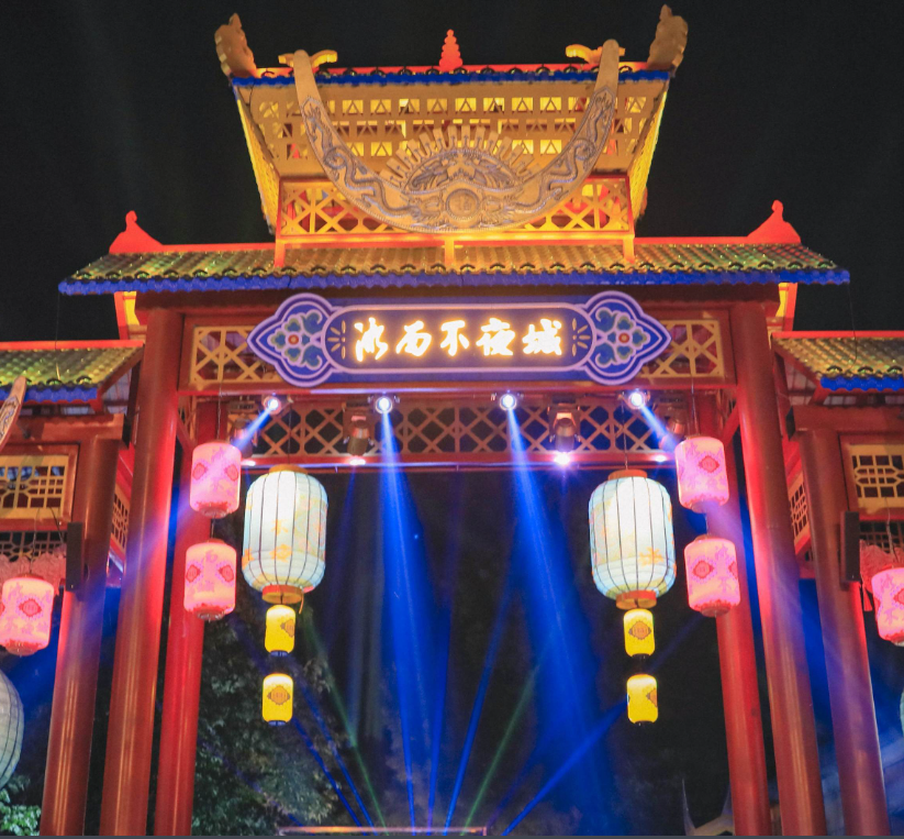湘西不夜城,將湘西文化特色融入到場景打造里,移步異景,氣勢恢弘的特色牌樓,熠熠生輝的燈桿,配合超2000盞湘西民族特色燈籠,為游客提供絕無僅有的感官體驗。街區(qū)設(shè)有特色舞臺11個,演員60余人,全天為游客帶來100余場極具視聽沖擊的文化演藝。同時,結(jié)合湘西地域風(fēng)情,創(chuàng)意了“千年一面”、“秘境湘西”等具有知識產(chǎn)權(quán)的原創(chuàng)演藝,游客樂游其中的同時,沉浸式創(chuàng)新傳遞湘西地域特色文化。